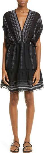 A contemporary take on artisanal craft, this cotton-blend dress features wispy fringe and contrast trim based on traditional Ethiopian tibeb weaving.