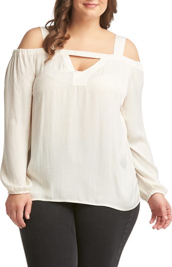 Cutouts exposing glowing shoulders and a peek of décolletage amp up the flirt factor of a blouse in a lightly textured woven fabric.