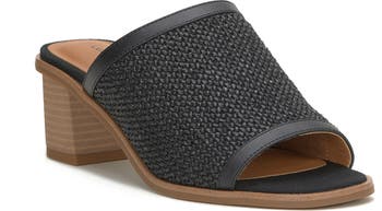 A weave texture adds dimension to a slide sandal lofted by a stacked heel for a classic look.