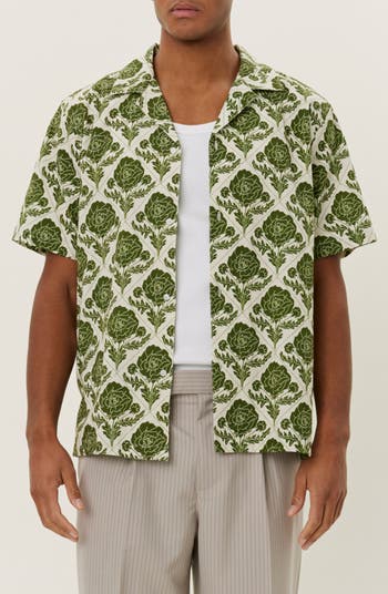 A gridded floral print brings a crisp touch to the relaxed vibes of this camp shirt cut from organic cotton that's cool and breathable in the season's warmth.