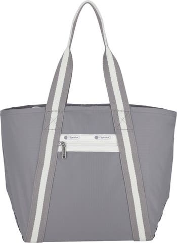 Striped, webbed straps secure the fit and define sporty appeal of this recycled nylon tote bag that updates the aesthetic with secure stash pockets for work or travel essentials.