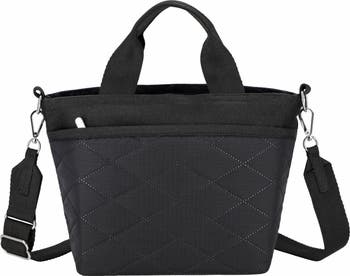 Sized for essentials with a minimalist design, this spacious nylon tote bag is topped with easy-to-wear top handles and an optional crossbody strap for versatile carry.