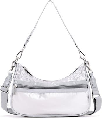 Logo-patterned webbing tape details this scaled-down shoulder bag made from flexible, lightweight nylon with a glossy coating.