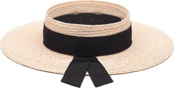 Show off charming vintage-inspired style with this woven hemp visor featuring a three-sixty-degree brim and black grosgrain ribbon trim.