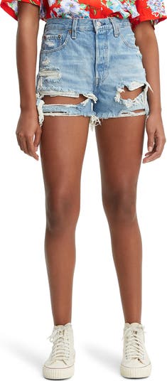 Your ticket to the most rocking, fest-ready style: these nonstretch denim shorts destroyed with holey abrasions and frayed cutoff hems.