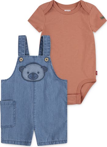 They'll love crawling and exploring their new world in comfort in this cute cotton set that pairs a soft bodysuit with coordinating denim shortalls featuring a bear-appliqué patch pocket.