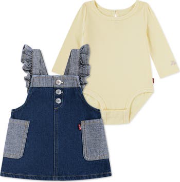 A mix of washes and ruffled trim define the denim dress in this charming set that's finished with a simple bodysuit that acts as a perfect layering piece.
