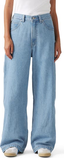 Perfect for curvy figures, these baggy carpenter jeans feature a superhigh waist with snap tabs in back to eliminate gapping.