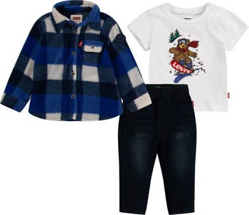 A snowboarding bear graphic adds playful style to this kid-approved three-piece set including a short-sleeve T-shirt, fleece plaid shacket and coordinating pull-on jeans.