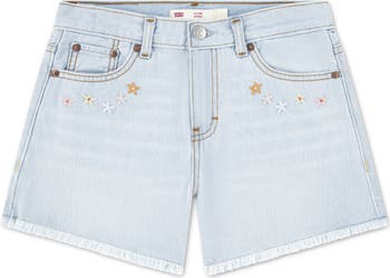 Crocheted flowers and stars lend kid-approved charm to shorts crafted from soft and stretchy denim for comfort whether on classroom days or weekend outings.