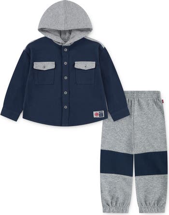 Keep your little one cozy in this two-piece set including a soft twill and fleece hooded shirt-jacket and fleece joggers boasting a cool colorblock design.