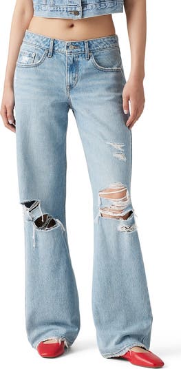 Inspired by jeans from the early 2000s, this nonstretch pair features a low-rise waist and ripped, full-length wide legs that create a laid-back look.