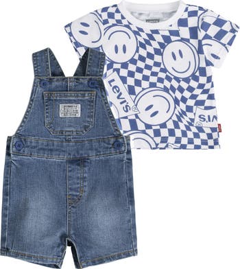 They'll love crawling and exploring their new world in comfort in this cute linen-blend set that pairs a smiley-graphic T-shirt with coordinating denim shortalls.