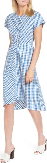 Cleverly shaped with a wrapped and ruched bodice and a twist of front pleats, a dress with ladylike charm features a fresh and summery check-plaid twill.