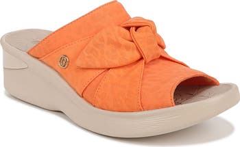 A soft knotted bow accents the stretchy fabric upper of this wedge slide sandal that's cushioned by a foam insole and an air-infused outsole. This sandal is machine washable—just toss it in the wash and you're good to go.