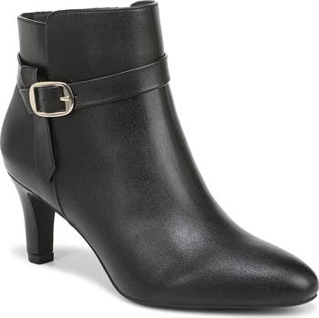 A wraparound buckle brings Western-inspired style to a pointed-toe bootie featuring an easy side-zip closure and a slender heel.