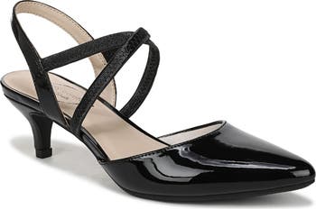 Crisscrossing elastic straps frame this chic pointed-toe pump featuring Soft System® comfort system and a flexible grip sole.