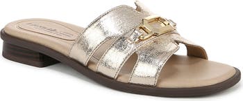 Geometric hardware and sleek cutouts enrich the upper of a weekend-ready slide sandal grounded by a cushioned footbed and flexible traction sole.