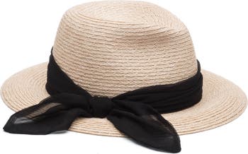 Perfect for your next vacation, this woven hemp fedora offers resort-ready style in a packable design accented by a black chiffon tie bow.