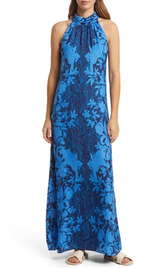 Picturesque blue flowers illustrate a paradise-ready maxi dress that'll have you feeling like you're on vacay whether you're traveling near or far.