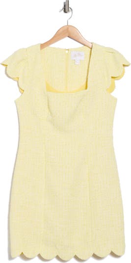 Scalloped edges further the contemporary whimsical styling of this shift dress cut from a sunny bouclé knit.