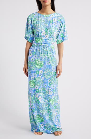 Bright blooms bring signature style to a casually graceful maxi dress designed with an open back.