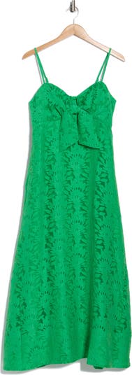 A front tie and a stacked palm burnout design bring a resort-ready feel to this fit-and-flare dress designed in a flowy maxi-length.