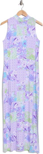 A patchwork print creates a kaleidoscopic burst of pattern and color across this columnar maxi dress cut from soft and stretchy jersey.
