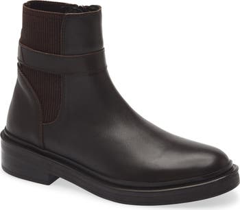 A round toe and chunky heel balance a sleek leather bootie fashioned with a side zipper for easy entry.