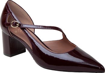 An asymmetric vamp strap and half d'Orsay silhouette bring stunning dimension to a pointy-toe leather pump lifted by a wrapped block heel. An OrthoLite® footbed and slip-resistant rubber sole offer comfort and stability.