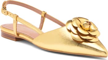 A faux leather rosette adorns a retro slingback flat that is shaped with a feminine pointed toe.