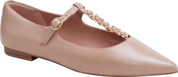 Textured hardware decorates a slim buckled T-strap atop a pointy-toe pump shaped from soft leather.