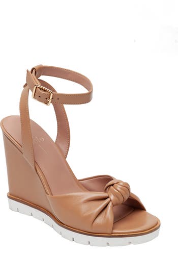 A knotted vamp strap creates visual intrigue on a contemporary leather sandal lifted by a wrapped wedge heel and durable rubber sole.