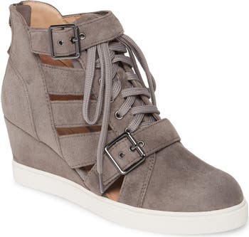 Cutout sides and buckled straps detail a high-top leather sneaker that's kicked up even higher on a curvy wedge and bumper cupsole.