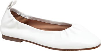 A gathered topline provides a graceful finish for a square-toe ballet flat with a lightly cushioned footbed.