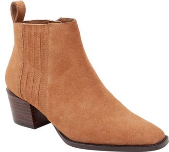 Tapering at the stacked heel and square toe lends a refined look to this essential bootie featuring foam cushioning and flexible goring at one side.
