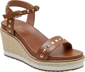 Glossy pyramid studs stand out against the sleek leather straps of an espadrille-inspired sandal lifted by a chunky platform and jute-wrapped wedge heel.
