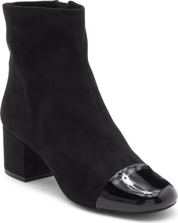 A glossy finish caps the toe of a signature bootie made on a slip-resistant rubber sole for increased traction.