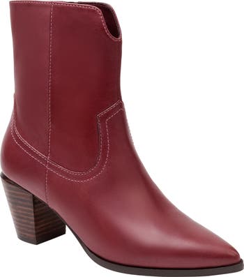 Western-inspired styling makes a subtle statement on a smooth leather bootie featuring a block-heel and foam-cushioned footbed.