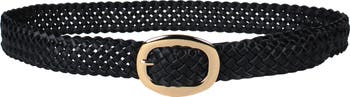 A gleaming oval buckle adds shine to this braided faux-leather belt.