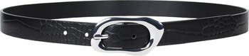 A gleaming molten buckle adds a modern flourish to a slim belt rendered in smooth faux leather.