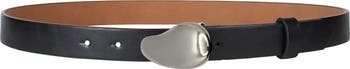 An organically shaped buckle adds a modern flair to a wear-anywhere belt crafted from smooth faux leather.
