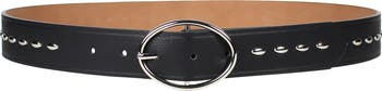 Oval-shaped studded hardware shines brightly against a wide belt crafted from smooth faux leather.