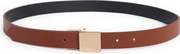 A gleaming plaque buckle brings a polished touch to this smooth faux-leather belt that reverses from cognac to black.