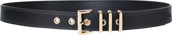 Three gleaming keeper rings add a modern flourish to a wear-anywhere belt crafted from smooth faux leather.