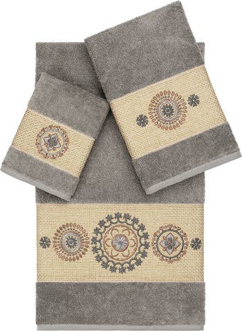 The Isabelle Embellished Towel Collection features an enchanting circular Mandala patterned embroidery on a woven textured border. These soft and luxurious towels are made of 100% premium Turkish Cotton and offer lasting absorbency and superior durability.