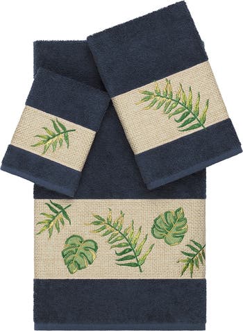 The Zoe Embellished Towel Collection features vibrant tropical leaves in applique embroidery on a woven textured border. These soft and luxurious towels are made of 100% premium Turkish Cotton and offer lasting absorbency and superior durability.