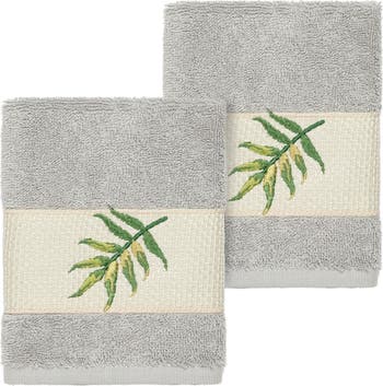 The ZOE Embellished Towel Collection features lush tropical leaves in applique embroidery on a woven textured border. These soft and luxurious towels are made of 100% premium Turkish Cotton and offer lasting absorbency and superior durability.