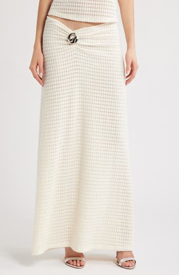 An shiny, organic-shaped hammered brooch accents the soft gathers at one hip of this textured-knit skirt that's ready to take your sashay to an alluring next level.