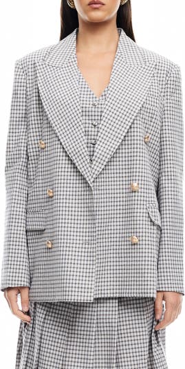 A boxy, oversized fit and wide peaked lapels add modern polish to this double-breasted blazer covered in classic checks and fronted by glossy goldtone buttons.